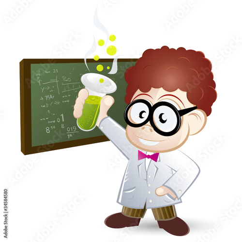Colorful chemistry illustration with beakers, test tubes, and molecular structures on a dark background.