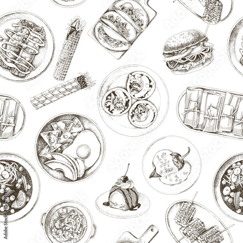 Mexican Food Doodle Seamless Pattern. Hand drawn eatery background with traditional dishes and ingredients. Latin American cuisine line elements. Vector illustration