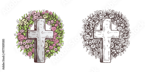 Risen black cross and floral design celebrating easter and jesus christ resurrection