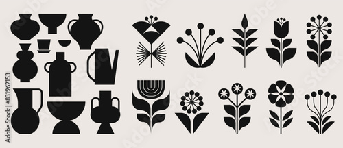 Illuatration of trendy vases with plants. There is space for logo and your text. Minimalist antique ceramic pottery for interior. Pattern for cover design, package, gift paper, background.