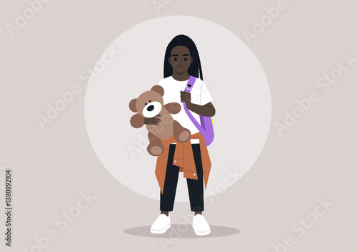 The lady is standing with a book, with a laptop in her hands, clutching her head in a panic, OK gesture, approval gesture. A beautiful slender African girl stands in different poses. Young black woman