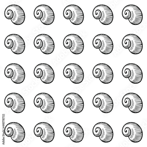 Vector illustration of a shell. A stylized illustration in the graphic style of linocut, with bold outlines and thin shading on a white background.