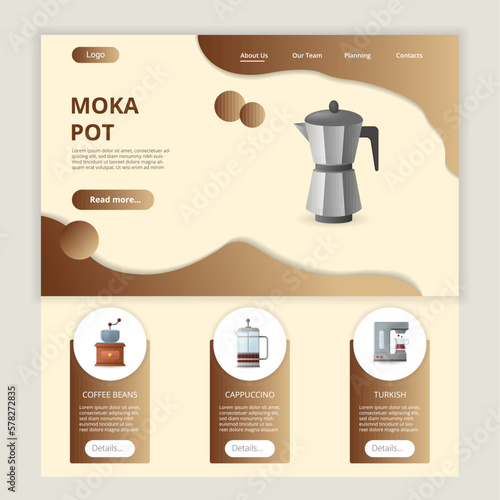 Espresso machine, cups, and coffee pot. Flat vector illustration of coffee mugs, beans, and brewing appliances. Morning breakfast lifestyle concepts. Coffee making equipment set.
