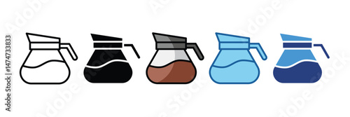 Coffee Pot Icons. Preparing a warm drink. Icon set. Set Logo of Coffee Pot: Pouring hot coffee. Stylized detail, Iconic shape, Minimal outline,