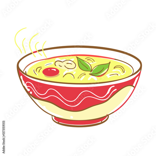 Monochrome illustration of a warm comforting soup in a ceramic bowl, garnished with fresh herbs.