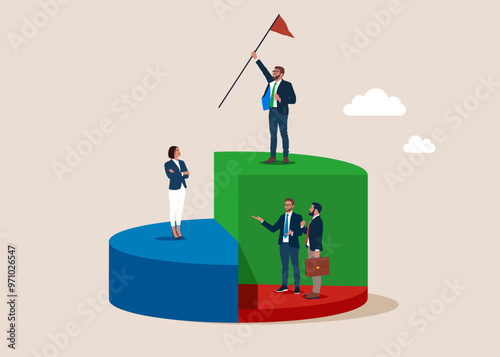 Success businessman holding flag standing on pie chart win over competitors. Business winning market share, earn high percentage of product sale.  Modern vector illustration in flat style