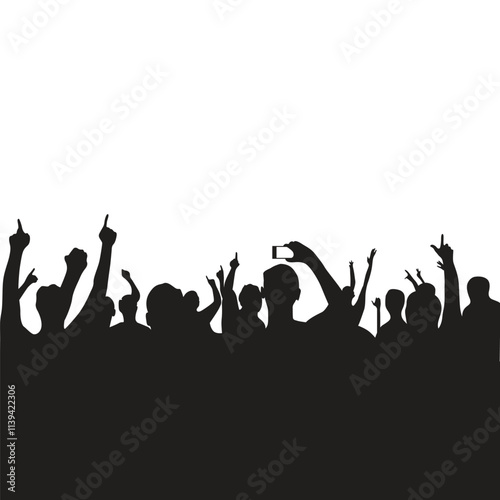 Concert crowd silhouette vector, cheering audience illustration, music festival fans, party celebration, rock concert people, live event design