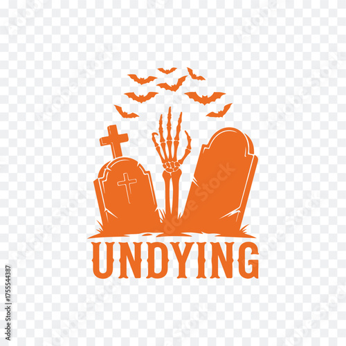 Halloween graveyard scene with a coffin, skull, pumpkin, crow, bat, and tombstone illustration