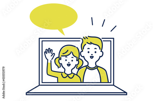 楽しくプログラミングを学ぶ二人の子供たちのシンプルでかわいい線画イラスト素材