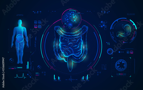 Doctor examining gastrointestinal tract, bowel, digestive system with magnifier. Intestinal inflammation, Enteritis, Colitis, Dysbacteriosis. Intestine health. Gut microorganisms and friendly flora.