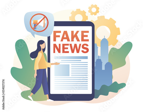 Hoax, fake news, disinformation spread via online media, news websites concept with small people and large phone vector flat illustration, suitable for background, advertising illustration