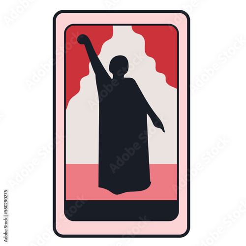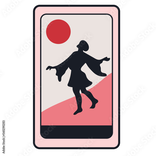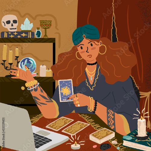 Fortune teller female character. Gypsy oracle. Cartoon illustration of a beautiful girl telling the future by seeing cards. Vector 10 EPS.