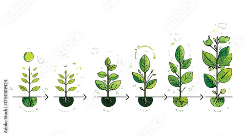 Vector progression of plant growth depicted with increasing size and leaf count on a white background image