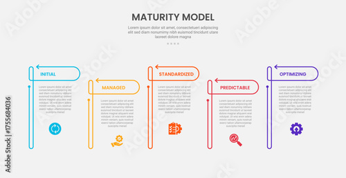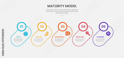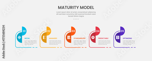 maturity model infographic outline style with 5 point template with creative box with round header and half circle badge for slide presentation