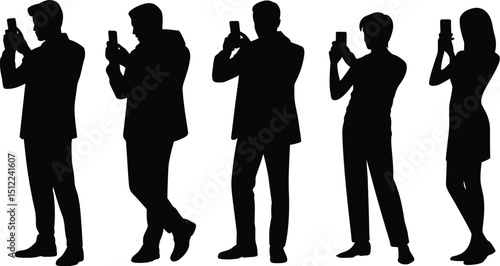 Silhouettes of five people standing and holding up their phones against a white background in a row shot