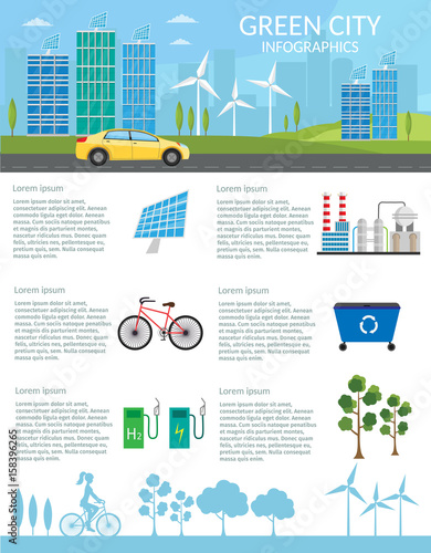 Green Eco friendly smart city landscape. Skyscrapers,solar panels, windmills, waste bins, electrocar, train, and electrobus.  Renewable energy, waste recycling. Web banner, template.