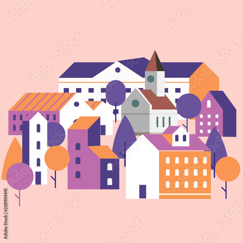Minimal cityscape. Flat town houses with eco nature environment, modern geometric buildings. Cityscape background, vector illstration