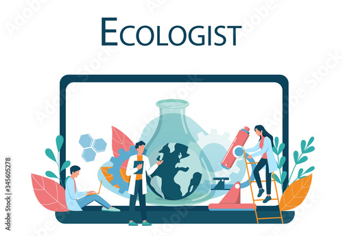 Scientists in lab. People in white coat work with glass flask and a test tube, chemical researchers with laboratory equipment. Illustration of science experiment in lab with green and yellow globe