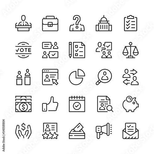Vote and Election, Icon Set. Voting, Ballot Paper, Debates, Online Voting, Statistics, Rally, Campaign, Candidate, Voting Box, Election Day. Civic Engagement and politics. Line with editable stroke