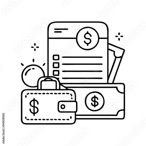 A line art illustration of a financial document with a dollar sign in light and dark gray