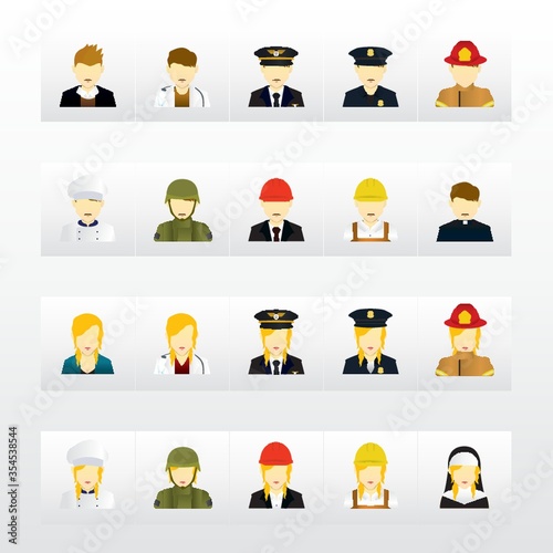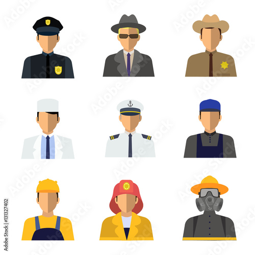 A group of people of different professions. Character design for doctors, pilot and stewardess, cook, repairman, engineer, builder and secretary. Flat vector illustration.