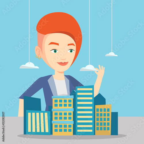 Cute construction foreman and female engineer characters on construction site with tower crane illustration
