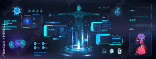 Examination of the person of the future, body scan and a complete analysis of the state of health in the HUD style. Healthcare infographics. UI, GUI, interface for Medical App. Research of human