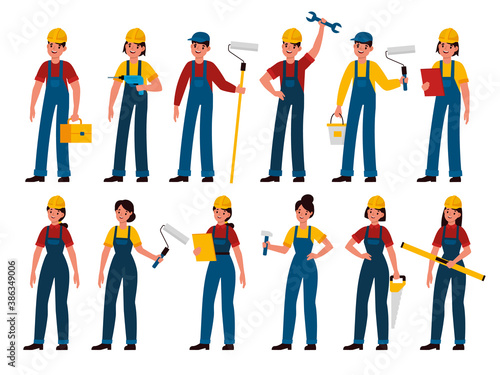 Builders. Men and women professional contractors, technician with toolbox, painter, carpenter and mechanic in uniform and helmet with tools saw, hammer and paint roller flat vector character