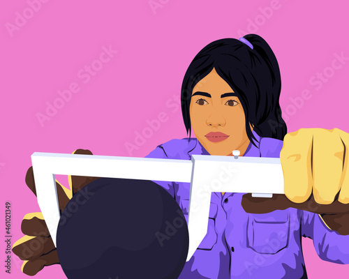 Cartoon mechanic or locksmith woman using a cordless screwdriver repairs a part in a workshop. Flat female character wearing in uniform with tools in hand. Composition with a professional