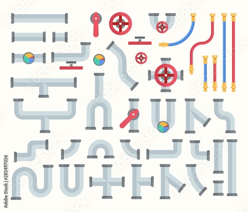 Pipe constructor set vector illustration. Massive ramified pipeline with big amount of different valves and faucets used to deliver hot and cold filtrated water flat style concept