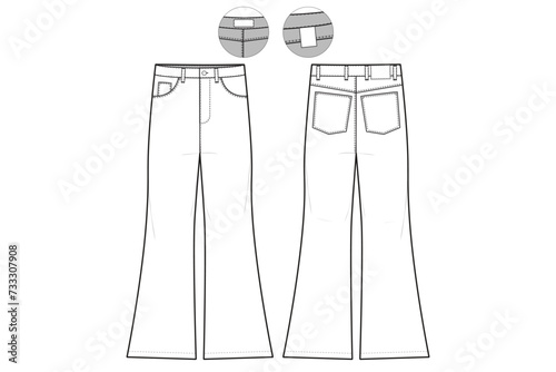 Cad drawing flat vector illustration, technical sketch of flared jeans, fashion design template, garment construction, denim apparel layout