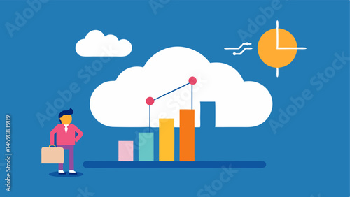 Business person analyzing bar charts and graphs, with a blue, orange, and white color palette