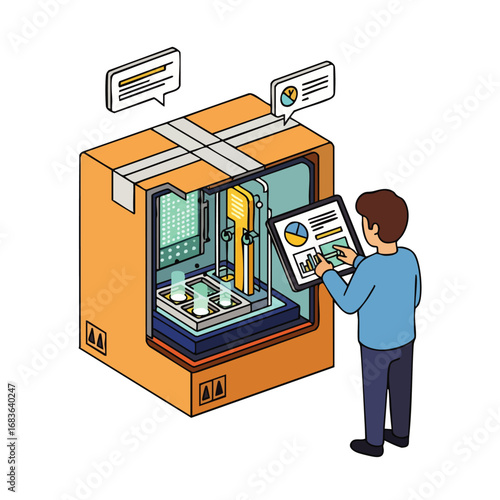 Warehouse automation concept. Worker controls robotic arm with smartphone. Autonomous robot for inventory management in logistics fulfillment center. Supply chain technology vector.