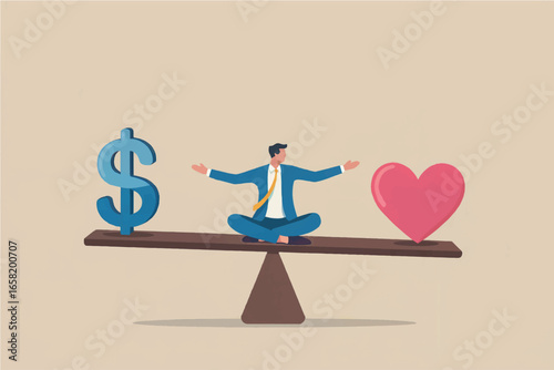 Businessman meditating balancing love and money on a seesaw representing financial harmony and personal fulfillment