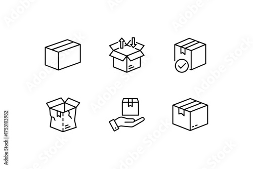 Shipping box and package delivery vector line icon set. Concepts for logistics, e-commerce, order fulfillment, parcel returns, receiving packages. Open, closed, damaged carton.