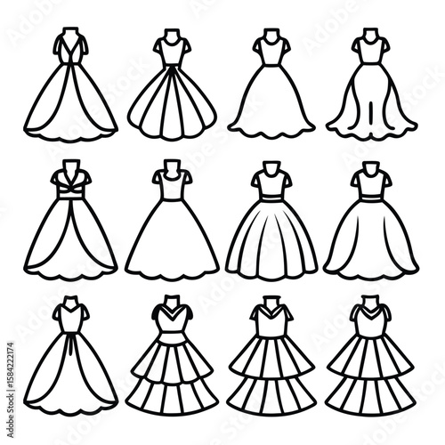 Elegant formal gown silhouettes, fashion design illustration, ball dress vector, bridal wear concept, stylish women profile, evening dress art