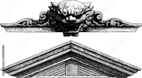 Set of drawing of traditional Chinese lions on a white background. Oriental Asian lion temple guard. Traditional ancient stone statue lion guardian. Lions are traditionally carved from stone. Vector.
