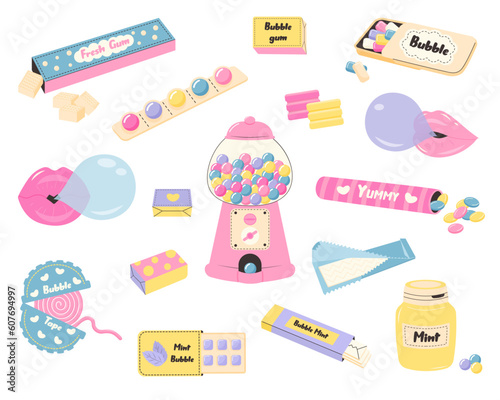 Bubble gum set. Cartoon chewing candy. Different chewing gum, roll, tape, pads, balls in packaging or blisters. Yummy dragee. 90s nostalgia.
