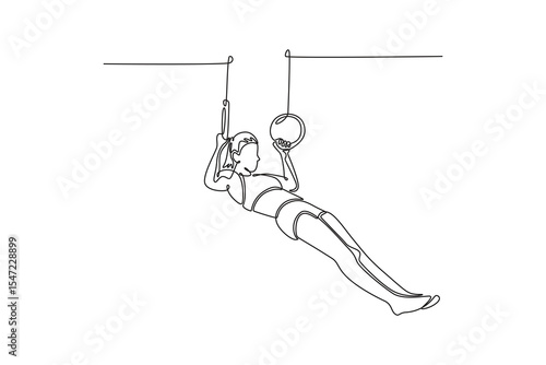 Single one line drawing muscular female gymnast exercising on gymnastic rings in modern health club. Gymnast athlete perform stunt in sportswear continuous line draw design graphic vector illustration