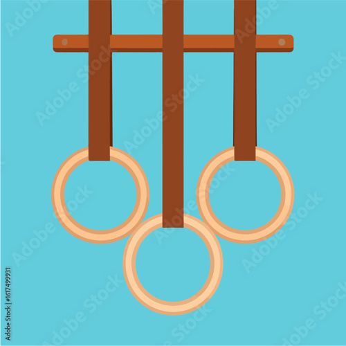 Vector illustration of three wooden gymnastic rings hanging from a wooden bar on a light blue background, perfect for illustrating fitness, sports or exercise concepts.