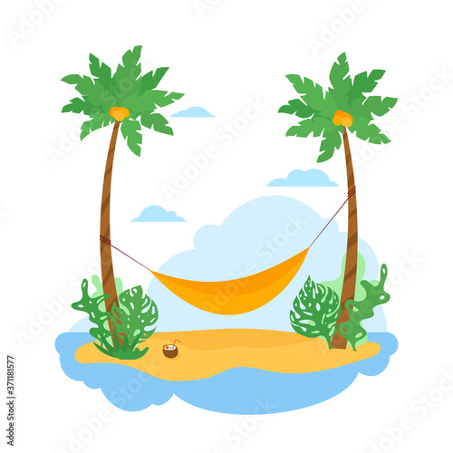 Beach with palm trees, hammock between two coconut trees. Tropical island with beautiful sea view. Flat style vector illustration