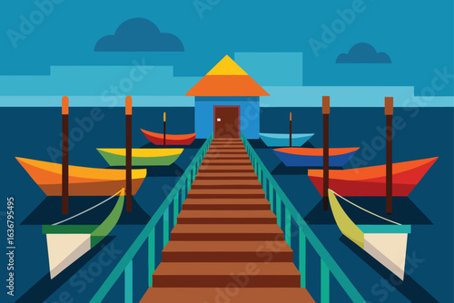 Seascape with rowing boats and seagull on pier vector illustration. Seaside holiday vacation travel poster background. Ocean bay scenic view with seabirds, yachts, sailing boats flat minimal design