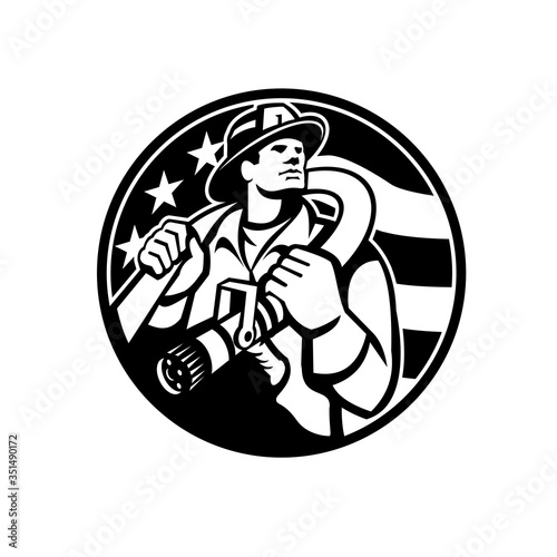 Courageous firefighter silhouette holding axe with american flag in a monochrome style