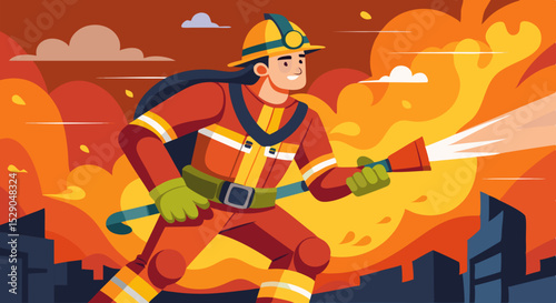 A minimalist 2D flat vector illustration depicts a brave firefighter holding a hose, rendered with clean lines and solid colors, isolated on a clean white background.