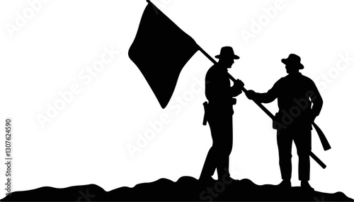 Surrender by raising white flag - Casual man on hilltop raising flag of peace and truce. Desire to parley concept. Vector illustration.