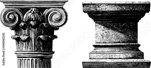 Set of classical ancient Greek and Roman architectural columns, detailed Corinthian and Ionic styles, ornate designs, vintage architectural elements.