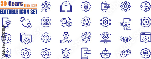 Gears line icon set. Set of outline icons related to gears, control, tool, system.
