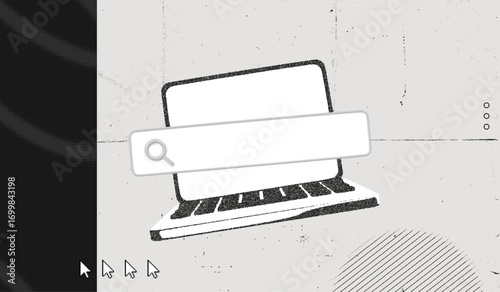 Trendy Halftone Stipple effect Computer laptop with Search bar. Seo marketing concept. Online search job. Grunge and vintage poster. Vector illustration art