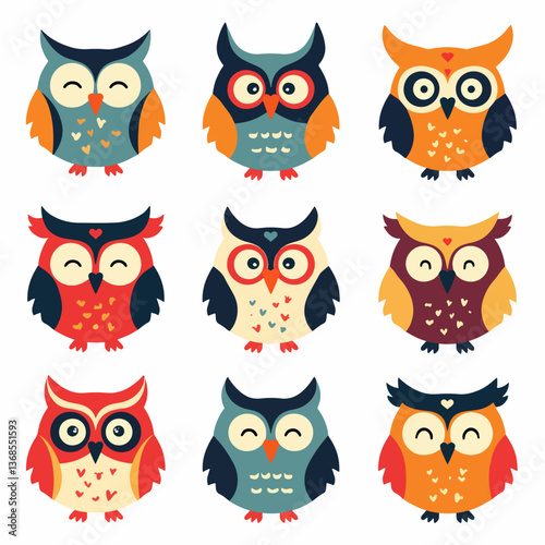 Set of cute owl illustrations in various colors, A colorful cartoon funny owl set on a white background