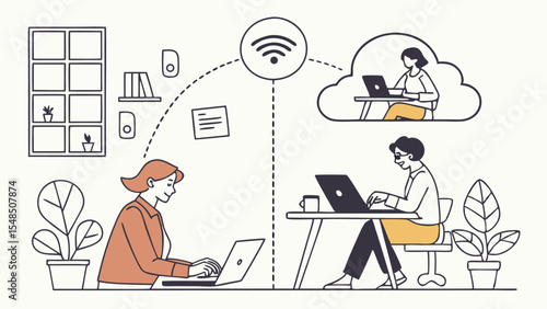 Flat Vector Illustration of Remote Work from Home – People Working in Home Office Setup with Computers, Plants, and Cat Representing Freelance and Online Work Concept
